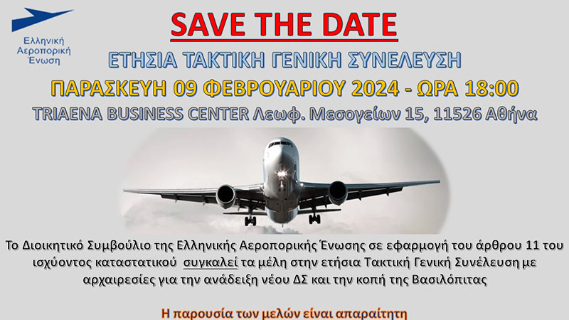 Αγαπητά Μέλη, Το Διοικητικό Συμβούλιο της Ελληνικής Αεροπορικής Ένωσης σε εφαρμογή του άρθρου 11 του ισχύοντος καταστατικού, και με απόφαση που έλαβε στην συνεδρίαση της 5ης Ιανουαρίου 2024, συγκαλεί τα μέλη σε...